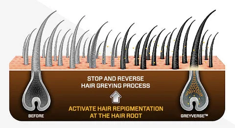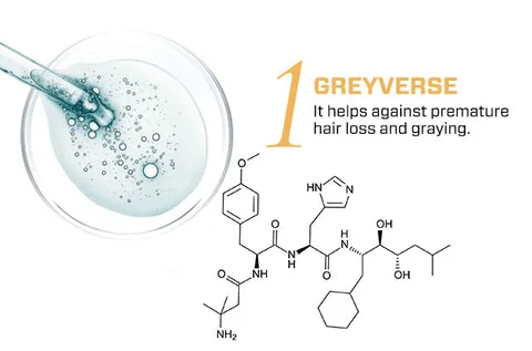Greyverse™ contains an innovative a-MSH biomimetic peptide able to act on the different causes of the hair greying process. It offers an unprecedented efficient solution to prevent, stop, and reverse this inevitable sign of aging. It stimulates melanogenesis to increase the production of melanin in the bulb and favour an improved transfer, which eventually leads to hair repigmentation.