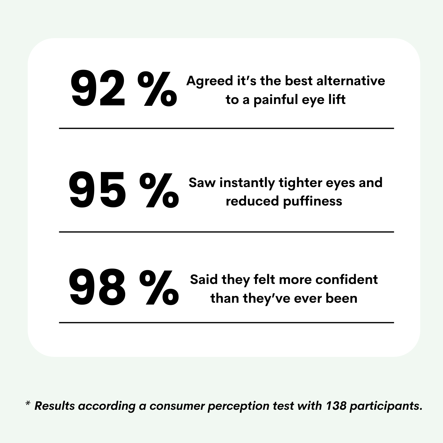 The result is and lasts up to 8 hours. In addition, from now on you can enjoy the comfort of being able to lift give yourself an eye lift at any time, comfortably and easily from home.