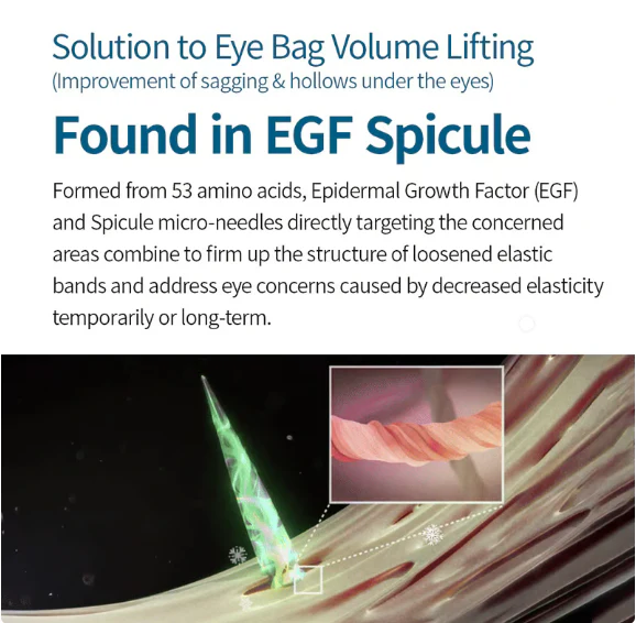 Introduces a groundbreaking solution with the Eyephalt Eyebag Cream, featuring EGF and Bio-Spicule micro-needles. Utilizing micro-needle technology, it stimulates collagen production and directs thousands of protein EGFs—formed from 53 amino acids—straight to the under-eye’s elastic bands, boosting elasticity and effectively tackling both immediate and lasting concerns.