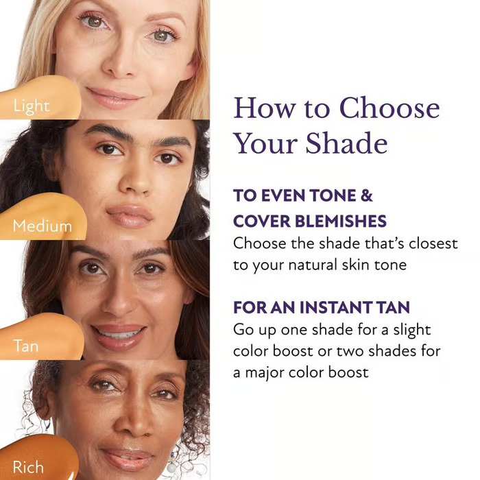 Body Application: Start with clean, dry, and oil-free skin to ensure the best transfer-resistance. Squeeze a liberal amount of product onto the area you'd like to perfect and gently blend in an upward and outward motion. Apply additional layers for more coverage, letting each dry for 60 seconds. For best transfer-resistance, let the product dry down completely for at least 10 minutes then remove excess by patting the area with a mitt or paper towel. ( Like blotting your lipstick!)